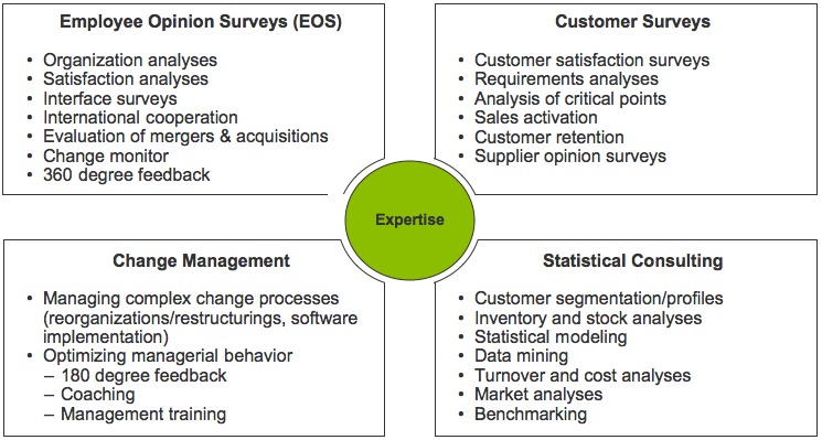 employee surveys, customer surveys, organizational and managerial development as well as statistical consulting.